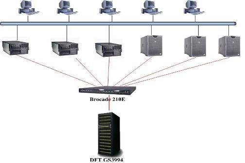 SAN的核心存儲部分,是DFT公司的GS-3994企業(yè)級智能存儲磁盤(pán)陣列,蚌埠學(xué)院圖書(shū)館的六臺服務(wù)器通過(guò)光纖交換機與磁盤(pán)陣列連接,構建了SAN存儲區域網(wǎng)絡(luò )。GS-3994所有的部件均采用了冗余設計,整個(gè)存儲系統不存在單點(diǎn)故障;該磁盤(pán)陣列配置5TB 裸容量、8個(gè)4Gb/s高速光纖主機接口和4GB支持鏡像寫(xiě)的高速緩存。GS-3994后端的磁盤(pán)通道為4Gb/s,