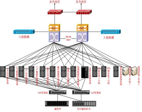 作為信息化建設的數據存儲基礎平臺,如何保證數據的安全和高可用性就顯得至關(guān)重要。這次內蒙古黨建要求在網(wǎng)絡(luò )中心部署1臺全4Gb光纖存儲陣列,通過(guò)兩臺光纖通道交換機構成核心的SAN存儲環(huán)境。以存儲設備為中心,支持數據存儲服務(wù)功能。