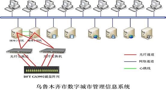 基于數字城市對信息高效率、高性能的要求,DFT工程師將DFT GS3992設置為統一管理、動(dòng)態(tài)分配的工作方式,以便于烏魯木齊數字城市監控管理中心操作和使用。同時(shí)為了保證核心數據庫可滿(mǎn)足7*24小時(shí)高可用性服務(wù),DFT工程師又按照要求,在兩臺IBM小型機上安裝雙機軟件,并將數據保存在DFT GS3992全光纖磁盤(pán)陣列中。由于數字城市系統是市民、企業(yè)、政府之間的數據平臺,所以對于整個(gè)系統的安全提出了近乎苛刻的要求,DFT工程師又為該存儲系統設計了全冗余架構,即服務(wù)器、存儲之間有多條鏈路,保證即使鏈路中的線(xiàn)路出現故障,存儲中的數據依然可以被訪(fǎng)問(wèn)