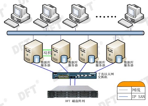 通過(guò)使用這種存儲架構,再將兩臺數據庫服務(wù)器配置成雙機的架構,在平時(shí)兩臺服務(wù)器運行各自的業(yè)務(wù)應用,當一臺服務(wù)器出現故障時(shí),雙機軟件會(huì )自動(dòng)用另一臺服務(wù)器接管故障服務(wù)器;當兩臺服務(wù)器出現故障時(shí),此時(shí)存放在磁盤(pán)陣列內的數據還存在,用戶(hù)可以再使用一臺新服務(wù)器接管所有業(yè)務(wù)應用。通過(guò)使用這種備份架構,可將4臺數據庫服務(wù)器的數據自動(dòng)備份到DFT磁盤(pán)陣列內(在數據庫使用的狀態(tài)下),并根據用戶(hù)的環(huán)境與需求定制備份策略,以保證數據的安全可靠。