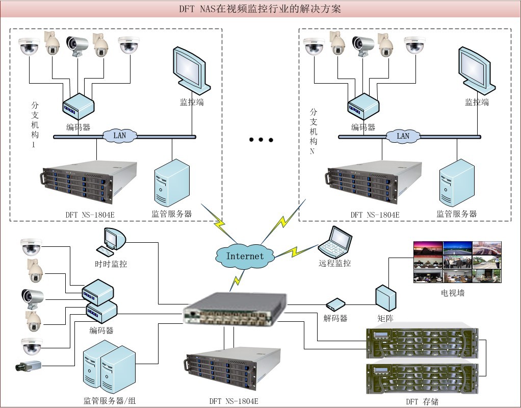 相比之下,對于需要采用分布式網(wǎng)絡(luò )監控的用戶(hù)來(lái)說(shuō),采用DFT NS-1804E作為存儲系統更適合新一代的網(wǎng)絡(luò )視頻監控的應用。NAS設備可分布在有網(wǎng)絡(luò )的任何地方,可以根據需要隨時(shí)擴容,并且靈活地制定存儲備份策略。NAS存儲設備已經(jīng)內置了數據管理服務(wù)器,用戶(hù)可以通過(guò)WEB界面直接設置用戶(hù)的訪(fǎng)問(wèn)權限,對不同的用戶(hù)分配不同的讀寫(xiě)權限。具體是用戶(hù)在每個(gè)分支機構配置一臺NS-1804E,前端的視頻采集端通過(guò)局域網(wǎng)將數據傳送到NAS,利用一臺視頻監控管理服務(wù)器對數據進(jìn)行管理,并且通過(guò)Internet可以將各分支機構的數據進(jìn)行遠程復制實(shí)現集中存儲,保證監控中心的數據完整性,遠端用戶(hù)在任何地方都可進(jìn)行實(shí)時(shí)監控和查詢(xún)。方案拓撲圖如下: