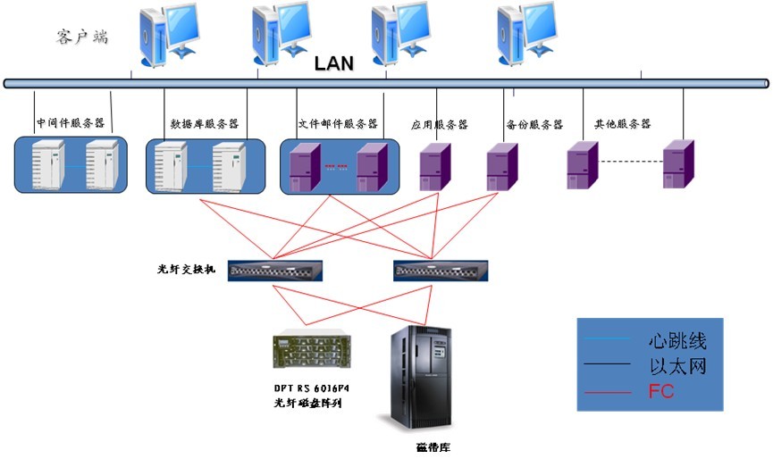 其余的服務(wù)器作為數據庫與文件服務(wù)器,配置對應數據庫的備份模塊。磁帶庫和磁盤(pán)陣列直接與光纖交換機相連。這種系統結構充分利用了SAN結構的優(yōu)點(diǎn),服務(wù)器上的備份數據流從磁盤(pán)陣列經(jīng)由光纖交換機,直接傳送給磁帶庫,不經(jīng)過(guò)公用網(wǎng)絡(luò ),因而不會(huì )對網(wǎng)絡(luò )的帶寬與性能造成任何影響。任何一臺機器都可以直接控制磁帶庫的讀寫(xiě),并通過(guò)SSO選項共享存儲介質(zhì)