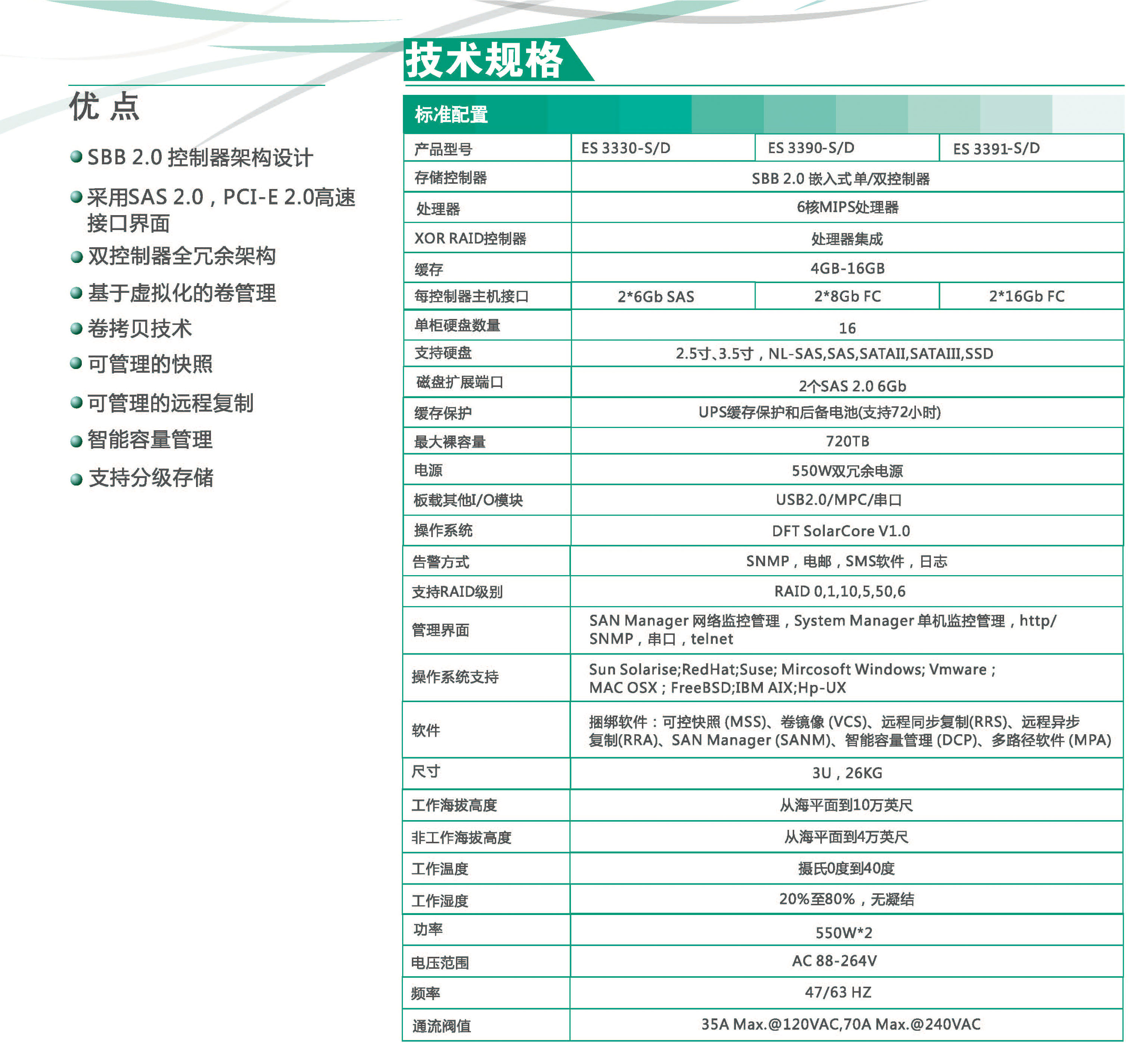ES 3000系列硬件設計上采用了SBB 2.0,模塊化設計,PCI-E 2.0,SAS 2.0等新技術(shù),搭建了一個(gè)高性能穩定的存儲平臺。ES 3000系列提供了各種豐富的存儲高級軟件功能,如快照,自動(dòng)精簡(jiǎn)配置,存儲虛擬化,遠程卷復制,能夠提供集成的數據保護、虛擬服務(wù)器的整合應用、出色的性能以及省卻存儲管理時(shí)間, 并為數據中心的商業(yè)應用提供高可靠性和高可擴展性。